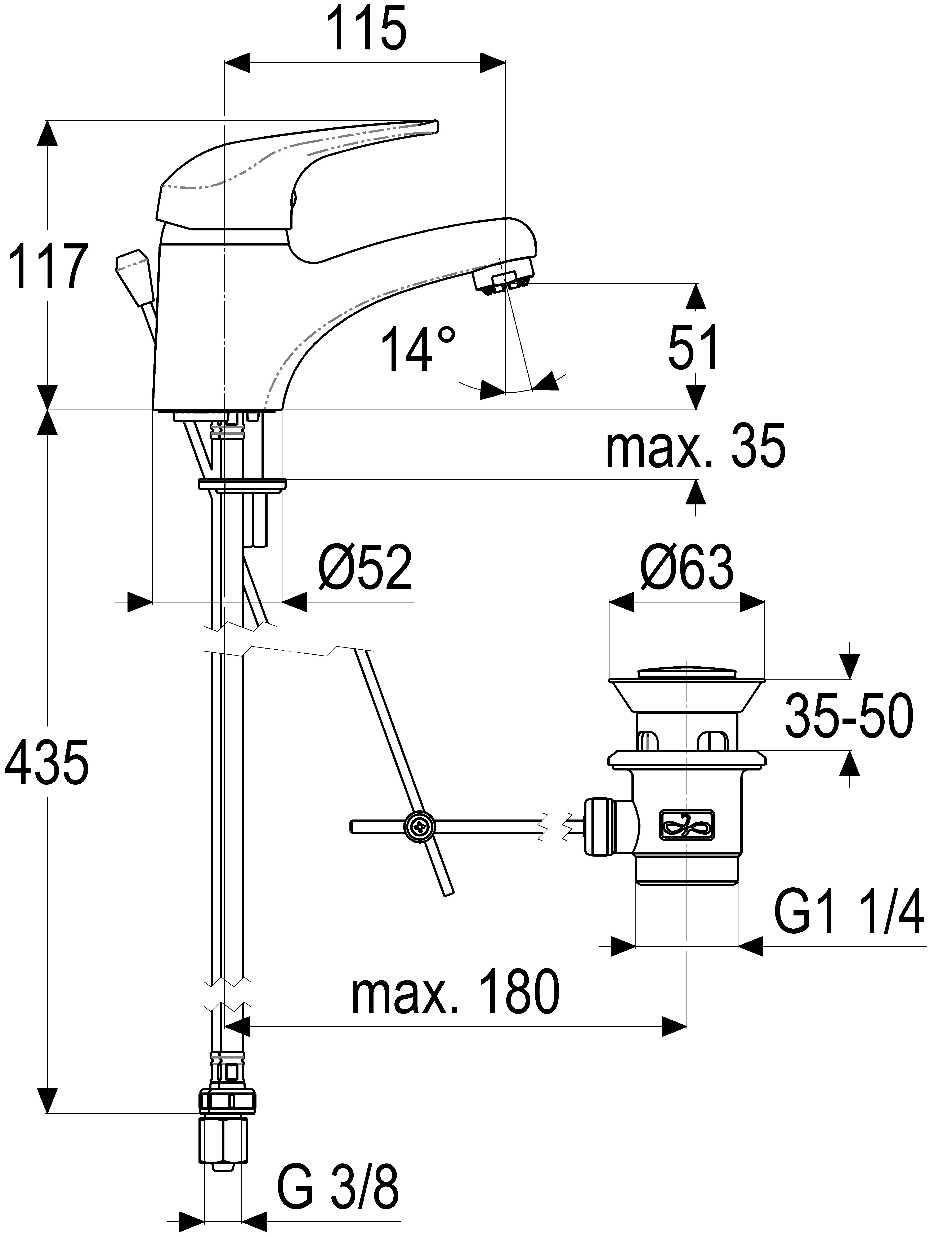 - height to aerator 50 mm